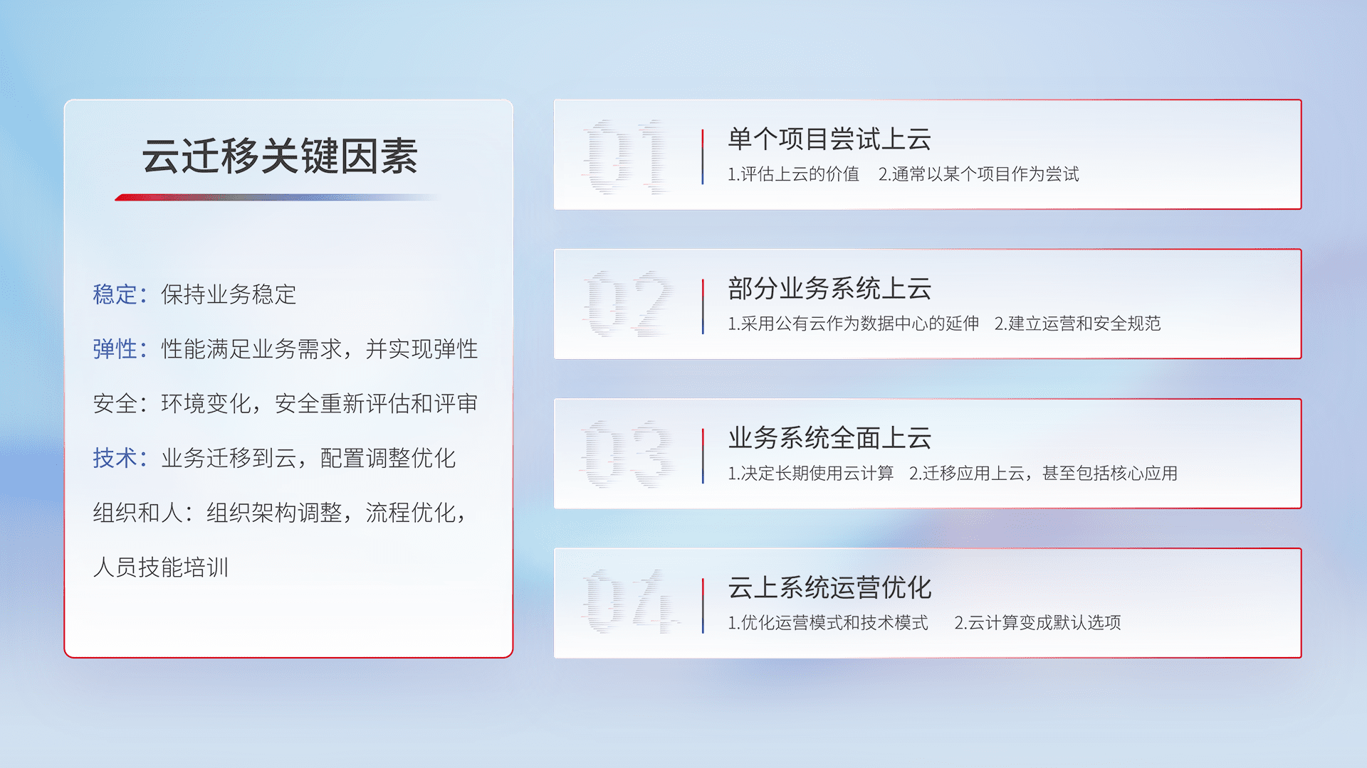 结合实际业务,,,从规划设计、、、云平台选型、、、、云原生改造、、、、数据迁移、、集成交付,,,,迁移全过程为客户识别最佳上云路径,,,做好风险识别管理,,,设计网络架构、、、身份权限、、、安全审计合规、、、操作审计、、日志审计、、、、监控告警策略、、多站点容灾设计等,,,,对云上基础设施进行整体规划,,,,提升IT治理水平,,,,以满足弹性、、、高可用、、高性能的需求。。。