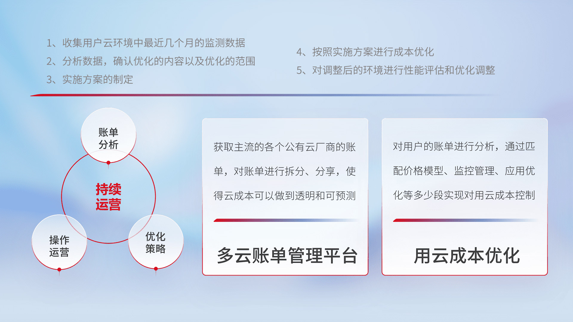 通过多云纳管,,以统一的资源数据模型把客户的云资源进行抽象和封装,,,,进而实现对多云资源的统一操作,,保障云资源管理的可靠性、、、、稳定性与可用性。。。量身定制化运维内容,,配置、、、、开发运维、、、补丁管理、、备份、、、、监控、、认证和访问管理、、、审计和日常巡检等,,保障在用云过程中的可靠度,,稳定度以及高可用率。。。。